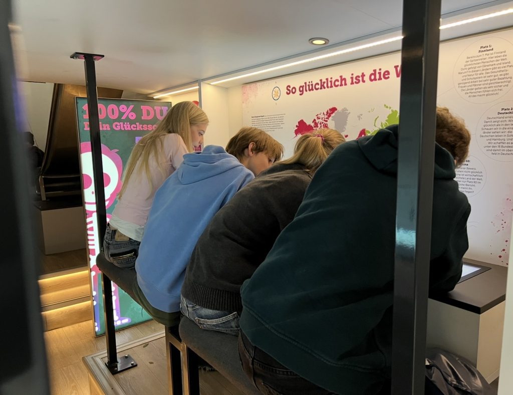 Vom 20. bis 24.10.2025 steht auf unserem Gelände der Ausstellungsbus GLÜCK SUCHT DICH. Die Ausstellung regt Kinder und Jugendliche dazu an, die eigenen Sichtweisen auf Glück, Identität, Konsumrisiken und Rauschmittel zu reflektieren. Das Konzept lädt zum Lernen, Mitmachen und Weiterdenken ein. Unsere Jahrgangsstufen 8 und 9 besuchen die Ausstellung im Rahmen des Unterrichts.