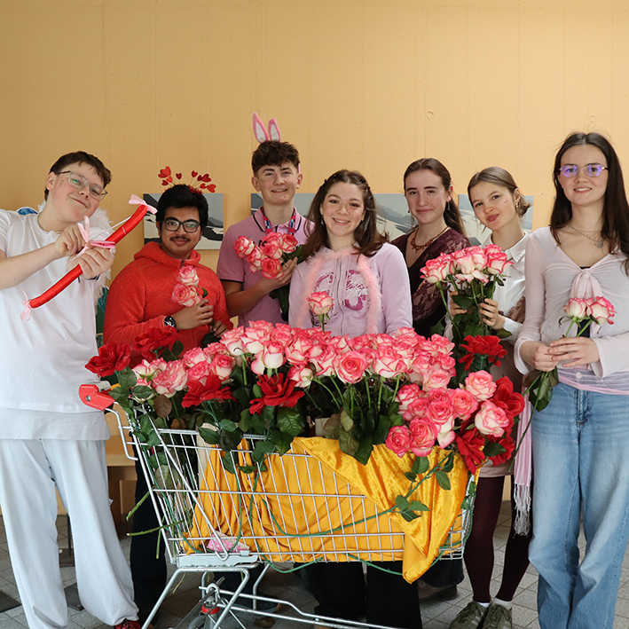 Dem traditionellen Aufruf unserer Schülervertretung zum anonymen Rosenverschenken folgten dieses Jahr kurz vor dem Valentinstag Viele: Ein Meer an Rosen wurde am 3. Februar 2026 an die Adressaten in Klassen, Kursen, Lehrerzimmer, Mensa, bei den Hausmeistern und im Sekretariat übergeben.