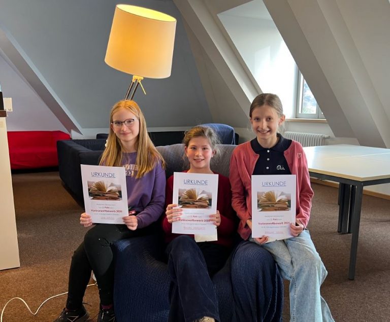 Am 9. Dezember 2025 wurden in unserer Bibliothek die drei Schulsiegerinnen des Vorlesewettbewerbs 2025 gekürt. Wir wünschen der Erstplatzierten aus der 6/2 viel Glück für