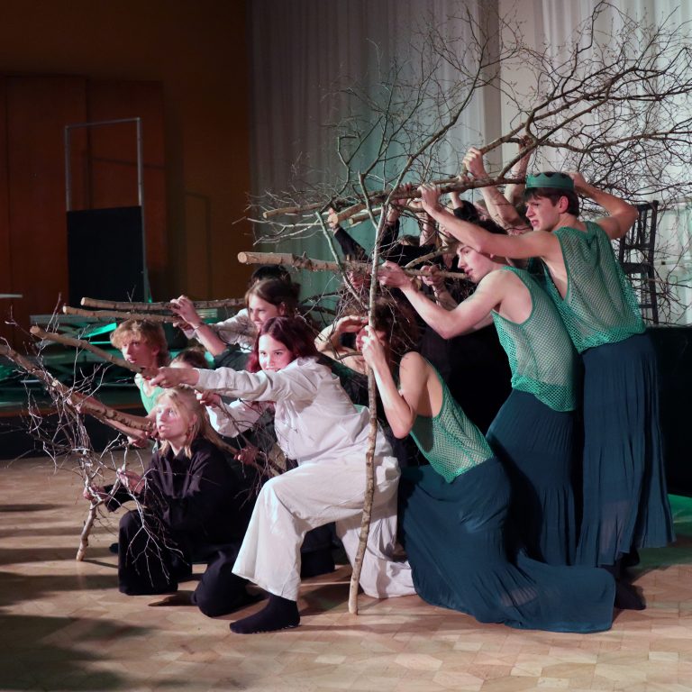 An der Collage zu Herman Melvilles Moby Dick, die am 19. Mai 2025 in der Aula des Evangelischen Kreuzgymnasiums vom Profil Darstellendes Spiel der Klassen